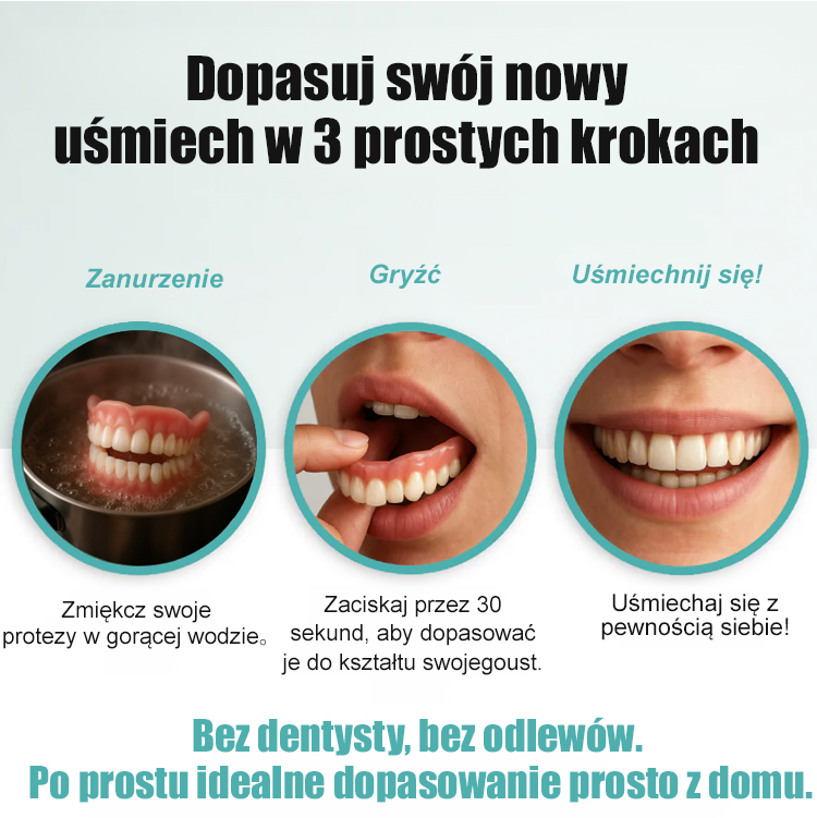 ⏱️ Idealnie dopasowana proteza w zaledwie trzy minuty – całkowicie bez użycia kleju i wizyty u dentysty! 🌡️ Namoczenie w gorącej wodzie aktywuje materiał, dzięki czemu bez wysiłku dopasowuje się do Twoich zębów! 😃 Super realistyczne dopasowanie – Twoi znajomi będą myśleć, że masz implanty! 🥩 Wygodna, bezpieczna i nie wypada – jedz, co chcesz! 🗣️ Naturalny uśmiech, wyraźna wymowa – nawet lepsza niż proteza wykonana przez dentystę! 👍 Całkowicie samodzielny montaż – prosta, wygodna i przyjemna w noszeniu! ✅ Antyalergiczna, hipoalergiczna i wytrzymuje lata – nawet bez codziennego czyszczenia!